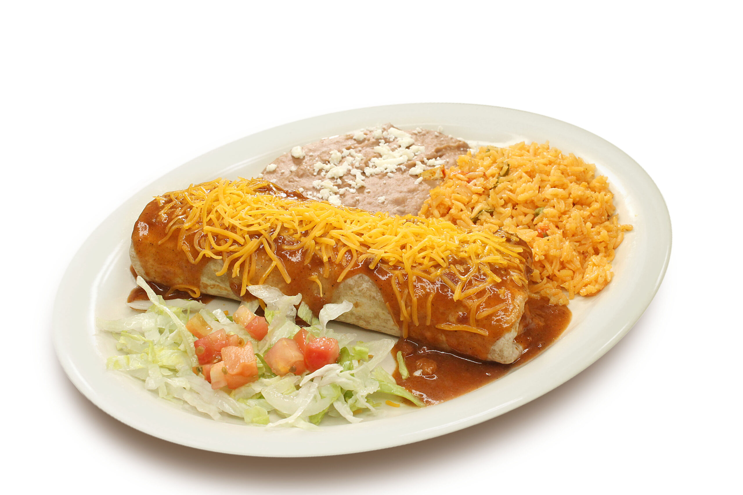 Ground beef with gravy and cheddar cheese served with rice and beans